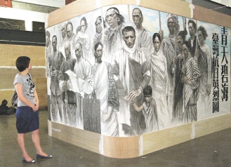 據報道,這幅抗日巨畫,由五十多名大陸畫家、歷史學家花了五年半時間集體創作八年抗戰的故事,按真人比例實錄一千多名歷史人物,期間畫家歐治渝甚至用眼過度差點失明。巨畫按真人比例實錄一千多名歷史人物,畫卷高二米,總長逾八百米,相當于小學操場繞四圈,展場橫跨臺北中山紀念館內外,堪稱“史上最高難度”。