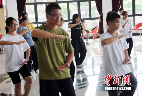 中新網(wǎng)7月5日電 7月5日,32名參加“2010年海峽兩岸青年聯(lián)歡節(jié)•中醫(yī)藥傳統(tǒng)文化研習(xí)營”的臺灣高校學(xué)子在福建中醫(yī)藥大學(xué)福州旗山校區(qū)學(xué)練24式太極拳。