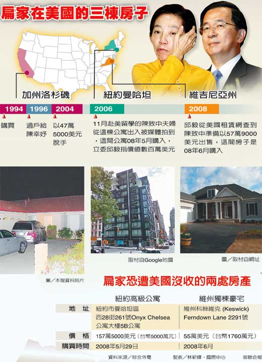 依美方資料,扁家在紐約市近曼哈坦八大道鬧區的豪華公寓,售價一百五十七萬五千美元(約臺幣五千萬元),在○八年五月二十九日購買;在弗州要價五十五萬美元(約臺幣一千七百六十萬元)的獨棟住宅,在同年六月購得。