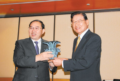 8日中午,海基會董事長江丙坤在臺北會見了率團正在參加“2010年臺灣湖南周”活動的中共湖南省委副書記梅克保一行。