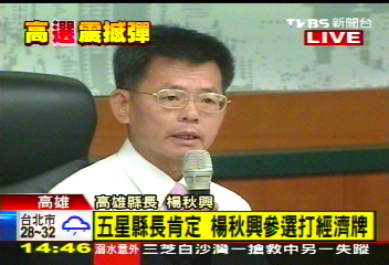 中新網8月9日電 據臺灣TVBS報道,高雄縣長楊秋興9日下午在縣府舉行記者會,正式宣布參選大高雄市長選舉,并對外體說明決定和參選的心路歷程。