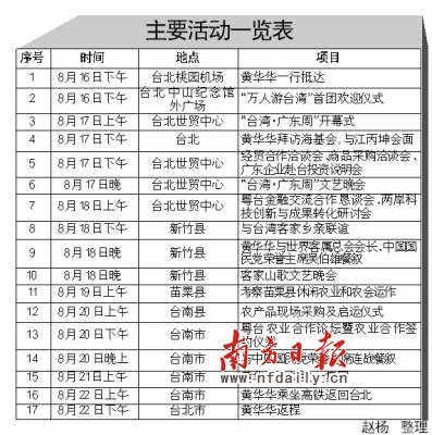 ●2010年8月16日,廣東省省長黃華華帶隊赴臺灣舉行“臺灣·廣東周”活動;顒又黝}為“合作之旅、鄉情之旅”,內容包括經貿合作、商品采購、旅游合作、農業合作、文化交流、宣傳亞運等,當日還將舉行“萬人游臺灣”首團啟動儀式。 (記者 陶達嬪 鄧紅輝)