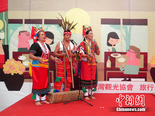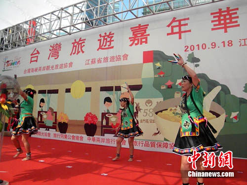 中新網南京9月18日電(記者 唐娟)18日,臺灣海峽兩岸觀光旅游協會(簡稱臺旅會)在南京舉行“臺灣旅游嘉年華”。這是臺旅會在大陸首度舉辦的戶外嘉年華推廣活動。在此間上午的嘉年華盛會上,臺灣藝術家們熱情火辣的原住民歌舞表演,將現場氣氛推至高潮。