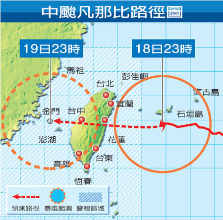 據(jù)報道,臺氣象部門表示,“凡那比”臺風19日凌晨5時中心位置在花蓮東方100公里海面上,以每小時20 公里速度向西行進,7級風暴風半徑200公里,中心平均風速由每秒43米增為45米,距強烈臺風下限每秒51米不遠,其暴風圈已籠罩中部以北、東北部及東部陸地,各地都有強風暴雨,但宜蘭、花蓮應特別警戒。