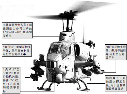 AH-1W武裝直升機機長約18米,高4米,最大起飛重量近6700公斤,采用串列座艙設計,由2名機組成員操控,裝備有機關炮、火箭彈、空空導彈和反坦克導彈,是目前臺軍直升機部隊中攻擊力最強的機型。(何西)