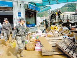 昨天一早大水消退后,蘇澳民眾在四千多名臺軍協助下,展開清理家園工作。蘇澳主要道路中山路上原本是雙線道,但因災民將家中受損的家具、沙發,全部搬到大馬路暫時堆置,整個蘇澳市彷佛就像大型垃圾場般紊亂,加上軍用卡車、垃圾車、推土機不斷來回,過往交通一度受阻。