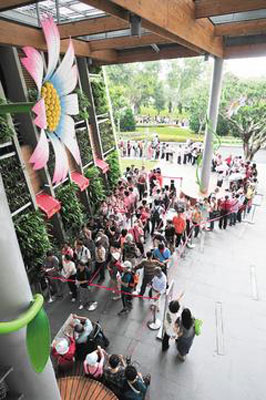 另外,針對夢想館、養生館、真相館、名人館、故事館等5個展館,花博總部采發放預約券入館,從早上9點開始一次發放,發完為止;其中最熱門的夢想館,每日發放四千張預約券,25日上午到11時左右則發了兩千多張,并未如預期“暢銷”;而之前同樣熱門的“夢想劇場”,因不發放預約券,采用現場排隊,場外則是大排長龍。