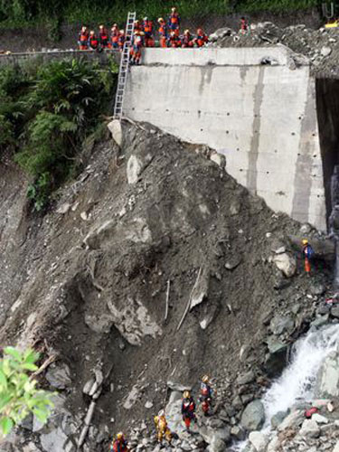 突然一道刺眼車燈從遠方駛近,1輛疾駛的工程車企圖闖過坍塌處,工地人員迅速沖向前,大聲鳴哨;就在哨聲回音未歇之際,一聲轟隆巨響,數顆大小不等的落石磙落地面,碎裂四射,其中較大的落石不比一個書柜小;慶幸的是,那輛工程車在落石前停了下來。
