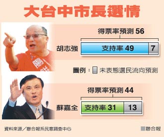 分析顯示,胡志強在臺中市獲得五成五支持,二成九挺蘇嘉全;臺中縣選民觀望比率較高,四成五力挺胡,三成二屬意蘇。