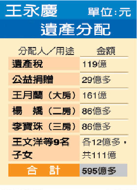 王永慶身后在臺灣留下595億元的遺產,大房王月蘭原本可分到其中一半297億元。但根據王家人的協議,王月蘭將把分到的一半遺產均分給二房楊嬌和三房李寶珠,兩人各得74億多元;至于剩下的一半遺產在繳稅和捐贈后,由王永慶的三個妻子和九個子女均分,每人可得12億多元。