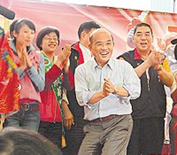 中新網(wǎng)11月14日電 民進(jìn)黨臺(tái)北巿長(zhǎng)候選人蘇貞昌13日出席松山霞海城隍廟活動(dòng),受邀與五路財(cái)神一起跳Nobody舞,但他脫了西裝外套,跳出來(lái)的舞步卻是Sorry Sorry舞,現(xiàn)場(chǎng)high翻天。