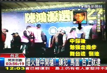 遭槍擊的連勝文,當時還勉強地往舞臺邊走了幾步,突然蹦一聲,倒臥在地,開槍的兇手林正偉,在面對舞臺的左邊,第一時間被警察跟民眾壓制在地。