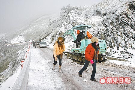 合歡山昨天從鳶峰以上的道路就開始出現(xiàn)積雪,太魯閣公園與埔里工務(wù)段雖多次出動鏟雪車清除路面積雪,但因車輛涌入,再加上鳶峰到武嶺、合歡山莊的道路狹窄,連鏟雪車都無法順利通行,不少車主因欠缺雪地行車經(jīng)驗,更發(fā)生車子打滑擦撞意外,甚至直接撞上山壁。部份駕駛?cè)四筒蛔⌒宰尤我獬嚕斐山煌ù蚪Y(jié),讓塞車狀況更為嚴重,武嶺以下塞車即長達7公里。