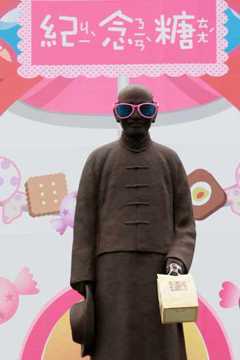 中新網4月10日電 據“中央社”報道,臺灣師范大學“糖果屋”裝置藝術展演活動10日在臺師大校園舉行記者會,有人把矗立在校園內的蔣介石銅像載上大眼鏡變成介紹美食的“紀念糖糖主”,但卻引來一位老伯伯表達不同看法,認為這樣“不尊重的蔣公”。