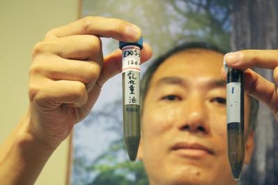 臺灣成功大學研發團隊6日公布研發的乳化重油節能技術,一旦普及,全臺灣年省油費300億元新臺幣。圖左試管為成功混合的乳化重油,右方試管是混合失敗的重油。(“中央社”圖)