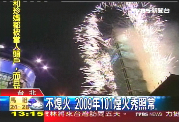 堅持續辦煙火,但是受到不景氣影響,本來101大樓應該在10月底就該定案決定贊助廠商,但直到現在都找不到贊助人選。2005年101大樓落成,舉辦了88秒的煙火秀,2006、2007則是由國際贊助商Sony舉辦了188秒的煙火秀,今年是交給臺“觀光局”辦理,但到了2009年,“獎落誰家”還是個未知數。