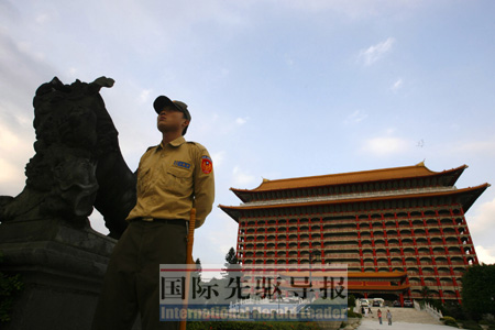 國際先驅(qū)導(dǎo)報(bào)特約撰稿沈宇哲發(fā)自上海 在臺(tái)北,有一座中國宮殿式建筑,它高達(dá)14層,隨處可見七彩畫梁、丹朱圓柱和琉璃金瓦。依傍基隆河、高聳于劍潭山之腰的它,正是海協(xié)會(huì)會(huì)長陳云林此次赴臺(tái)下榻的臺(tái)北圓山大飯店。