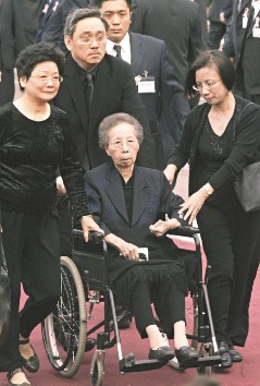 臺塑企業創辦人王永慶的長子王文洋25日打破沉默,透露存證信函是王永慶元配王郭月蘭(中)所寄的。圖為王郭月蘭日前由王文洋等人陪同出席王永慶的告別式。圖片來源:臺灣《聯合報》
