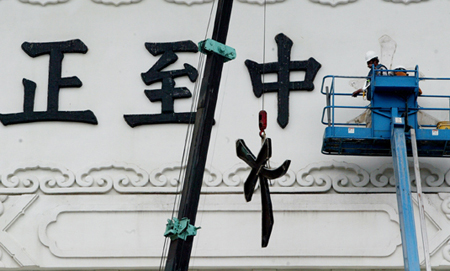 臺灣當局拆除中正紀念堂“大中至正”牌樓內外側共八個字,陳水扁甚至以太監李蓮英來比喻:“被割掉了,還能裝回去嗎?”圖為“大”字被拆下時的情況。記者游順然/攝影