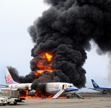 華航在日本琉球那霸機場發生火燒機意外!華航緊急疏散157個旅客,8個機組員也平安脫逃。圖為蔡湘雪旅客逃出時所拍的現場華航飛機爆炸畫面。記者周文郁/翻攝