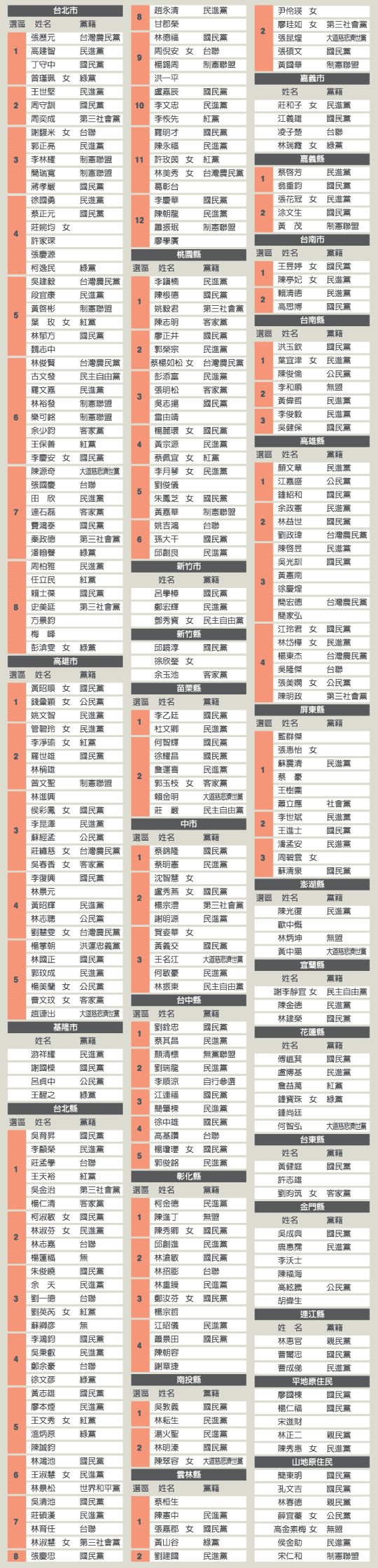 臺灣第七屆“立委”選舉區域候選人登記名單