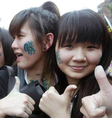 民進(jìn)黨活動上參加活動年輕人在臉上寫“勝”字挺謝長廷。 聯(lián)合報(bào)圖