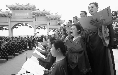 上午9點半,此次活動的重頭戲——保生大帝頌典儀式開始。在數通鳴鐘響鼓之后,兩列身著錦衣、手持斧鉞的古裝衛士沿著石階緩緩而下,海滄青礁慈濟宮理事長呂根銓、臺灣保生大帝信仰總會創會理事長廖武治作為主祭人,率領290座各地宮廟代表,在保生大帝神像前開始隆重的頌典儀式。詠讀頌文、獻花獻果、贊唱,吸收了祭孔、祭黃帝和祭媽祖的保生頌典儀式,讓現場的兩岸鄉親大飽眼福。頌典儀式上還進行了充滿懷古思緒的歌舞表演,身著多彩輕紗的舞者翩翩起舞,幾十人的古裝儀仗隊整齊排列于兩旁,盡顯盛大莊重的氣氛,也向現場所有來賓展示了中華文化的禮儀和鮮活的民俗文化。