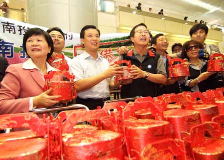兩岸周末包機啟動,大陸客首發團四日抵臺,擁有日月潭地利的南投縣,由縣長李朝卿(左四)親自領軍,前往桃園機場接機,歡迎大家到南投觀光。 “中央社”圖