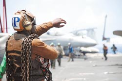 其中身穿黃色制服的是導(dǎo)引官和督導(dǎo)官,負(fù)責(zé)戰(zhàn)機彈射前的定位和引導(dǎo)工作,當(dāng)他蹲下用手?jǐn)[出向前沖的手勢,就代表戰(zhàn)機可以彈射升空﹔白色制服人員則是安全組,負(fù)責(zé)甲板上人員警戒和安全醫(yī)療﹔穿著綠色制服的是彈射組,負(fù)責(zé)將戰(zhàn)機前輪固定在航母彈射器上,以及恢復(fù)攔截索定位。