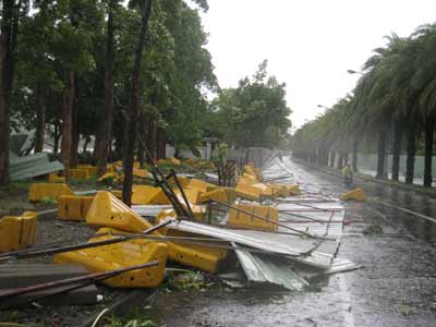 高雄市客家文化園區新建工程不堪強風吹襲,鐵皮圍籬一路倒塌,嚴重影響車道的暢通。