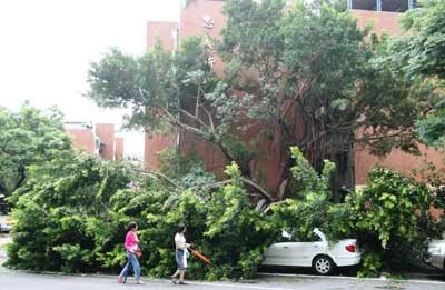 “鳳凰”28日侵襲臺灣,臺北市忠誠路一段一顆路樹中午遭強風吹斷,擋住了人行道,路過民眾只好繞道而行。