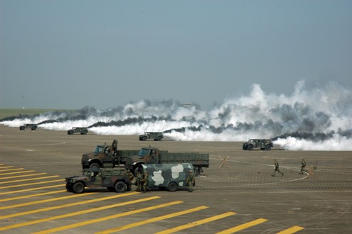 臺軍第五作戰區“漢光24號”演習,23日在臺中清泉崗空軍基地舉行空降暨反空降演練。圖為煙幕排以五輛渦輪發煙車,對空降場實施煙幕遮障。(“中央社”圖)
