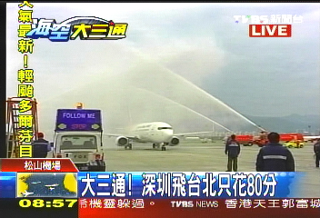 中新網(wǎng)12月15日電 15日上午8時40分,深圳航空ZH9095航班從深圳提前飛抵松山機(jī)場,成為兩岸直接“三通”首個抵達(dá)臺灣的大陸航班。