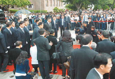 家屬親友部屬下跪迎靈。