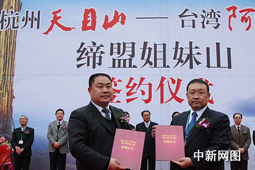 中新網(wǎng)杭州2月24日電(記者 龔讀法 實(shí)習(xí)生 姜越潮)即杭州靈隱寺與臺(tái)灣中臺(tái)禪寺結(jié)盟之后,杭州天目山與臺(tái)灣阿里山結(jié)為姊妹山。2009年2月24日上午,在浙江省杭州市天目山山腳下,天目山與阿里山的代表舉行了“杭州天目山——臺(tái)灣阿里山締盟姐妹山”合約簽字儀式。并互贈(zèng)禮物。