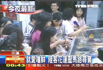 中新網(wǎng)6月18日電 據(jù)臺灣TVBS報道,大陸赴臺游踩線考察團昨天晚上抵達花蓮,不顧先前勞頓,依舊精力旺盛,吃東西、買東西,對花蓮的名產(chǎn)樣樣覺得很新鮮。花蓮業(yè)者半買半送,希望口碑能借由考察團帶回大陸。