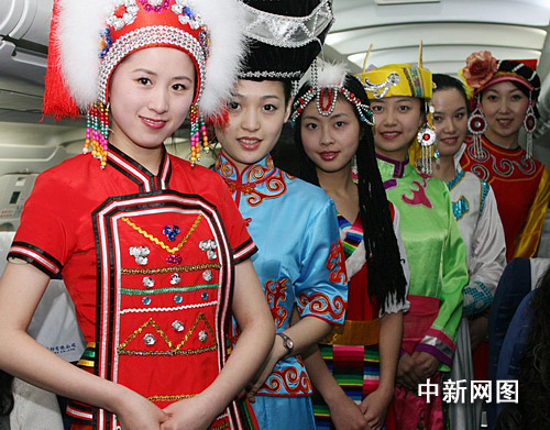 25日下午,“民族之花”乘務組的姑娘身著漂亮的民族服裝提前亮相。 “走進川航客艙,就如同來到了四川”,執行首航航班的“民族之花”乘務組乘務員說,我們要讓臺灣旅客感受到美麗四川的風土人情,體味到四川美景美食。