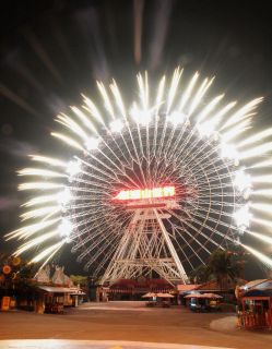 在摩天輪上施放煙火,將摩天輪設計成巨大燦爛的煙火球,創造出的視覺效果令人驚艷贊嘆。云林縣一處大型游樂場為迎接2009年新年,跨年夜當晚將推出煙火秀,15日晚上先行試放時,美麗景象就讓現場民眾忍不住發出陣陣驚呼。