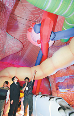 記者先走入“格列佛人體藝術探索館”一探究竟,從巨大的腳掌進入,首先映入眼簾是大腿骨和腳掌骨,充滿普普藝術的彩繪風格;創意團隊將小腸化身為LED燈的迷宮隧道,還能看到跳動的心臟,利用氣球制造肺部呼吸頻率,栩栩如生。