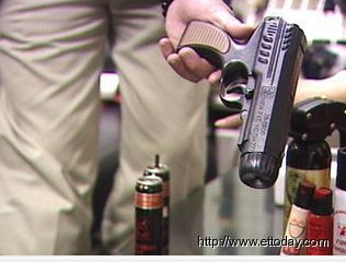 防身器材業者陳慈美表示:“這個叫做辣椒噴霧槍,它們噴出來的距離是5公尺到7公尺,噴出去的話是直線形,然后再擴散,有點淺咖啡跟辣椒那種紅色的顏色出來。”
