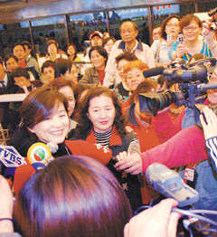 林青霞就是不一樣,人還未出關,先行通關的民眾已交頭接耳,“很水(漂亮)哦”、“穿大紅色,美女啦”,待她一現身很多粉絲干脆不走了,有人拿出珍藏多年“窗外”海報請她簽名,還有人把“東方不敗”劇報帶來,林青霞感動得大叫:“你們怎么有這些?”巨星看來比粉絲還興奮且激動。