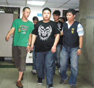 臺北市警方逮捕涉嫌擄人凌虐強索遮羞費的惡煞,其中嫌犯林楓杰(中)還逼被害人吞下兩顆子彈,手段兇殘。 (圖片來源:臺灣《聯合報》)