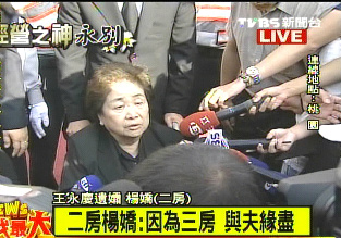 中新網10月17日電 臺灣“經營之神”王永慶過世,王家人日日夜夜守護靈堂,三任妻子也難得在鏡頭前露面,其中二房楊嬌今天首度公開談起丈夫王永慶,她說:此生難尋如此好人。