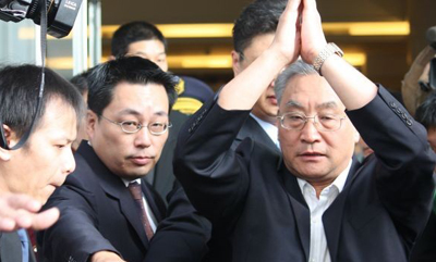 海協會副會長張銘清22日上午離開臺灣前雙手合十。