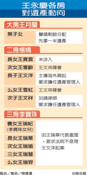 今年五月,王永慶長子王文洋瞞著家族,向美國新澤西法院跨海興訟,要求調查王永慶海外資產,并申請擔任遺產管理人。這件臺灣史上金額最高的遺產官司昨天首次開庭,卻又爆出同為二房的王文祥、王雪紅等也要求取得遺產管理人資格,讓官司更復雜。