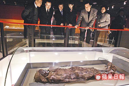 在媒體面前看展的馬英九稍有些心不在焉,看完樓蘭美女和棺木后,就打算從媒體前轉(zhuǎn)頭走人,漏掉旁邊“且末寶寶”的標(biāo)本,不過周美青顯然對且末寶寶有興趣,她停下腳步還拉了馬一把,把旁邊解說板的說明,念給馬聽,兩人又一同看個仔細。