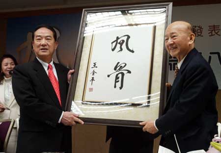 曾擔任高雄縣長九年半的林淵源,口述“風骨─林淵源八十談往”一書二月二十五日出版,前“臺灣省省長”宋楚瑜(左)代表臺“立法院長”王金平獻上風骨提字,以表祝賀之意。(“中央社”圖;孫仲達攝)