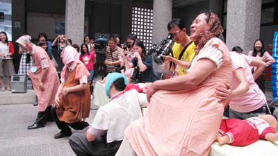 中新網3月4日電 據“中央社”報道,屏東縣4日舉辦婦女節系列活動中的“超級媽媽闖關”活動,縣長曹啟鴻(右)等扮孕婦,體驗媽媽的辛勞。