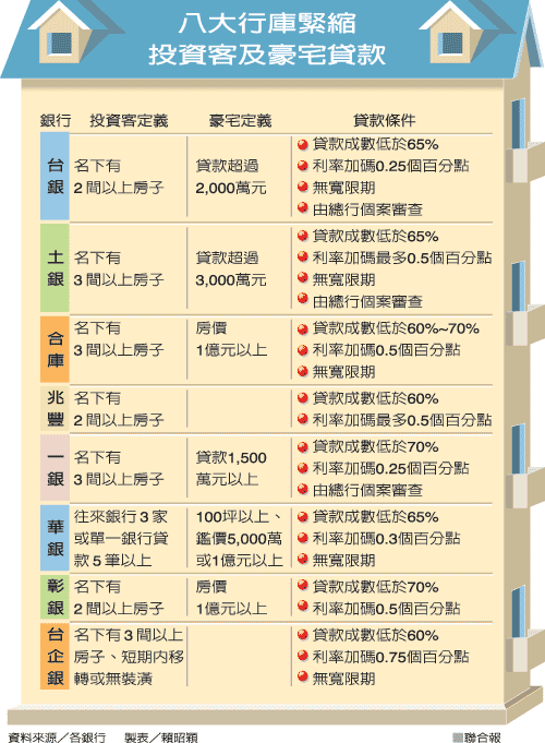 對投資客最嚴(yán)的是臺灣企銀,董事長羅澤成說,只要個(gè)人名下有三間以上的房子,符合房子未裝潢、短期移轉(zhuǎn)等條件,利率將大幅加碼0.75個(gè)百分點(diǎn),貸款成數(shù)上限也只有六成,同時(shí)取消寬限期。