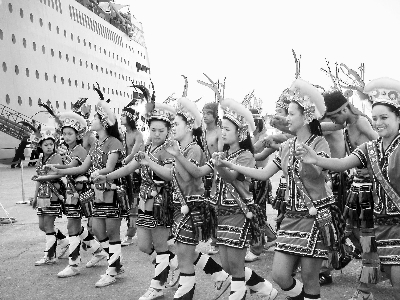 13日,安利團員乘坐的郵輪停靠花蓮港口。早晨7時,已經有花蓮原住民阿美族的姑娘小伙身著盛裝,在港口用歌聲和舞蹈歡迎大陸來的客人。